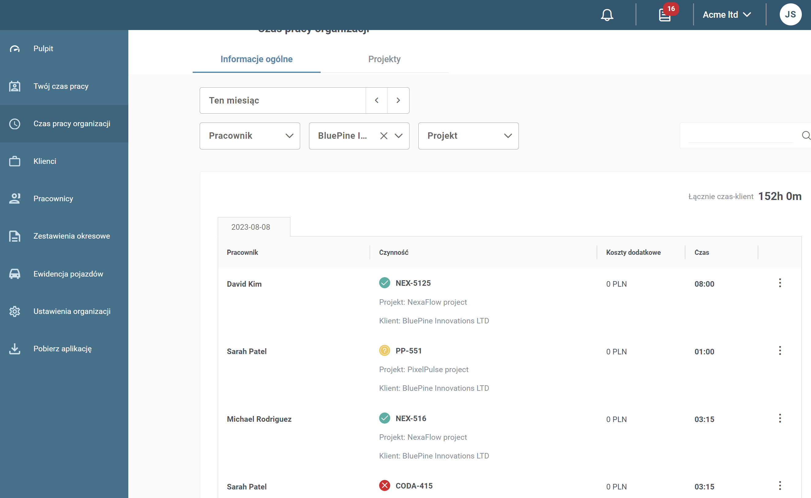 Zobacz jak wygląda szybki podgląd na aktualnie ilości zaraportowanego czasu przez wszystkich pracowników z podziałem na klientów, pracowników i projekty: